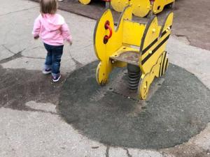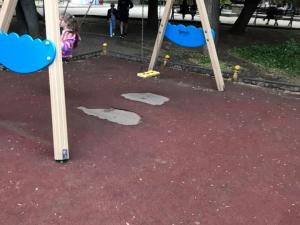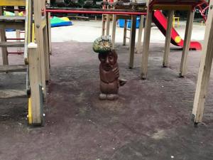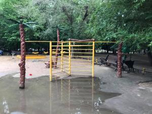 Деревянные фигурки рушатся. Черепах уже нет, гномы скоро потеряют свои шляпы. Деревянные перекладины со старой лазалки тоже наполовину выломаны. Ругательные надписи не смываются. Мягкое покрытие уже сильно плешивит» - сообшила Ольга Радина.