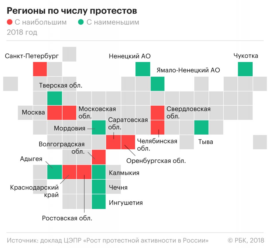 «Больше всего протестов в 2018 году прошло в Санкт-Петербурге, Ростовской области, Краснодарском крае, Саратовской, Московской, Оренбургской, Челябинской, Свердловской областях, Москве и Волгоградской области. По сравнению с прошлым годом из числа самых протестных регионов выбыла Новосибирская область и добавился Петербург», - ссылается на данные ЦЭПР издание.