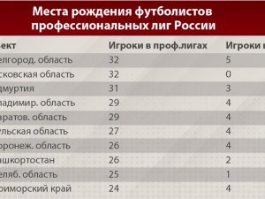 Лидером стала Москва, где родились 198 игроков профессиональных лиг нашей страны. Второе место занял Краснодарский край (109), а третье - Санкт-Петербург (95). В первую десятку также вошли Московская, Ростовская, Самарская области, Северная Осетия, Татарстан, Алтайский край и Волгоградская область.
