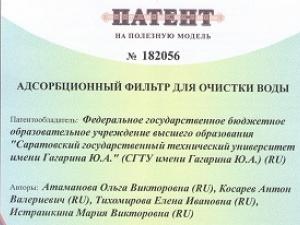 Ученые кафедры «Экология» Саратовского государственного технического университета имени Гагарина Ю.А. получили патент на «Адсорбционный фильтр для очистки воды».