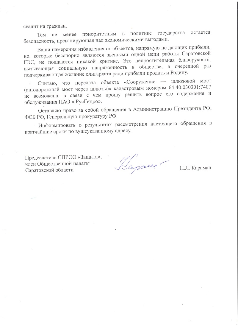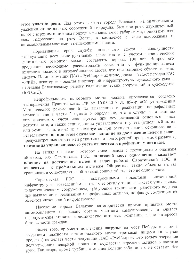 «На взгляд населения, которое живет рядом с таким потенциально опасным объектом, как Саратовская ГЭС, шлюзовой мост однозначно оказывает влияние на достижение целей и задач работы гидроэлектростанции и относится к профильным активам компании. Такие объекты нельзя сравнивать и сопоставлять с объектами соцкультбыта. Это не одно и тоже, - настаивает Караман. - Население города Балаково категорически против принятия автомобильного моста на баланс органа местного самоуправления и считает недопустимым ставить экономические интересы компании выше интересов безопасности граждан».