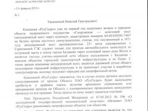 В свою очередь автор обращения пытается доказать адресату, что ненужное ПАО сооружение «является управленческим активом, участвующим в реализации целей и задач деятельности Саратовской ГЭС».