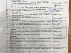 В подтверждение своих слов он опубликовал материал из «раздатки» ко вчерашнему заседанию думской комиссии по реализации в регионе национальных проектов и государственных программ. Так, в перечне объектов культуры, участвующих в партийном проекте «ЕР» «Культура малой Родины», значатся дом культуры Балтайского района и ДК села Багаевка Саратовского МР. Причем в качестве их кураторов указаны облдепы Дмитрий Пьяных (ЛДПР) и Наиль Ханбеков (КПРФ).
