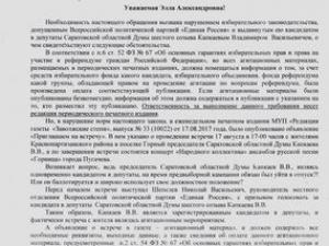 В жалобах Алимовой главам избирательных комиссий (документы публикует сайт «Пугачевское время»), в частности, говорится, что в еженедельном муниципальном печатном издании «Заволжские степи» от 17 августа опубликовано приглашение на встречу со спикером облдумы Владимиром Капкаевым. Мероприятие должно было состояться в день выхода газеты в поселке Горный Краснопартизанского района, по завершении которого сельчанам обещали концерт ансамбля русской песни «Горница» из города Пугачев.