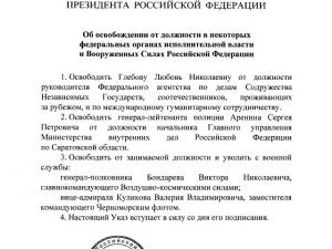 Президент РФ Владимир Путин отправил в отставку начальника ГУ МВД по Саратовской области Сергея Аренина. Соответствующий указ был подписан главой государства сегодня, 26 сентября.